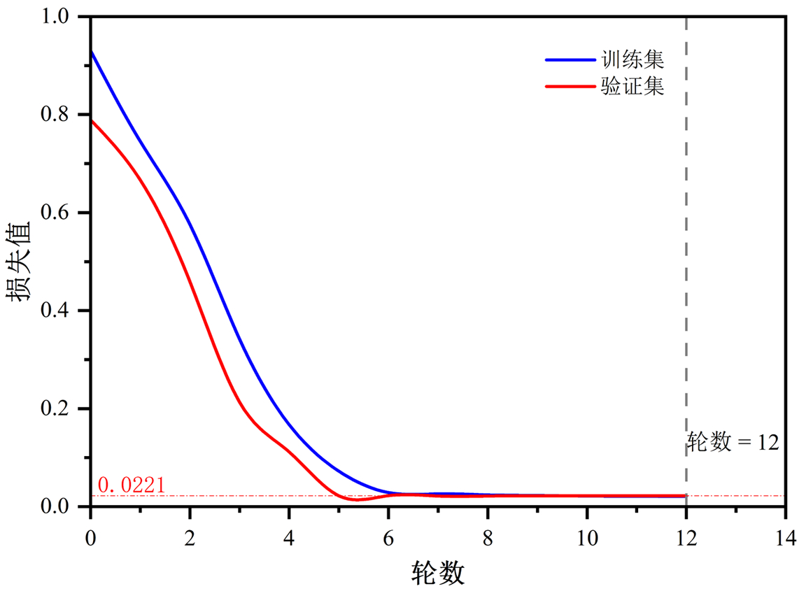 训练过程中,通过设置最小化损失函数来优化模型性能。批量大小设置为 8,学习率采用 6000 步的预热机制,初始学习率为1,以确保模型的稳定收敛。该模型共训练了 12 个 epoch,并采用早期停止策略避免过拟合。最终,模型在训练过程中成功收敛,损失值达到0.0211(图4),并获得最佳性能。