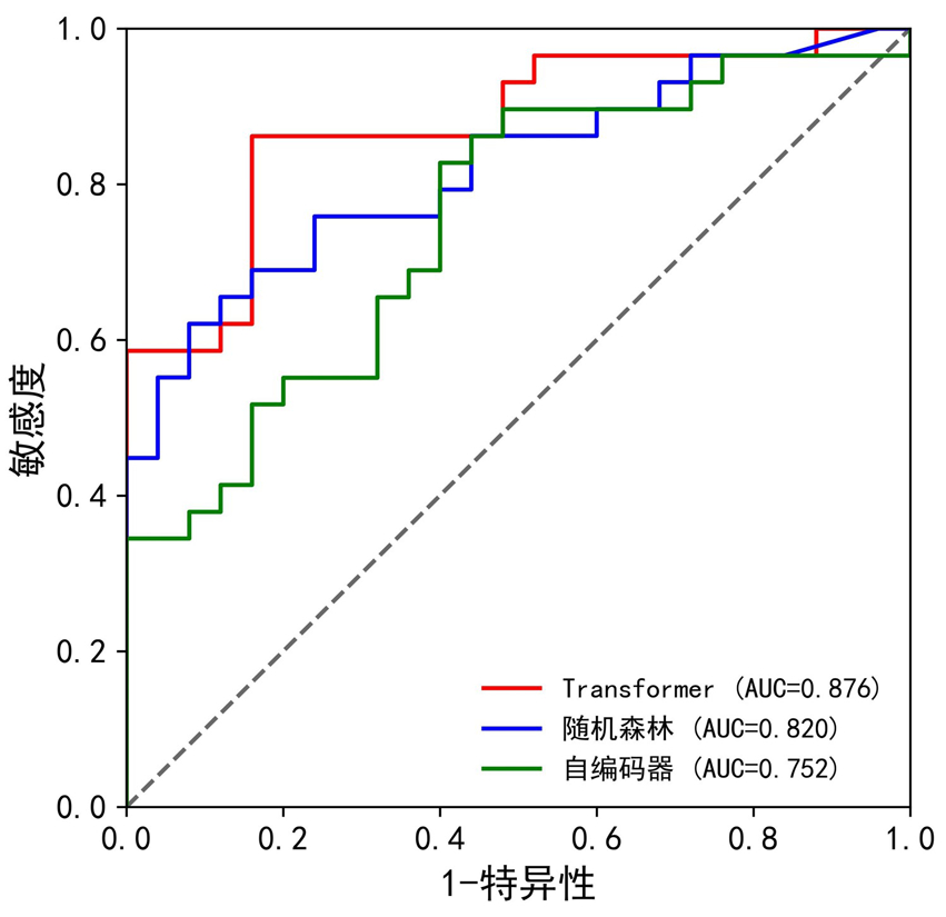 图6基于随机森林、自编码器和Transformer模型的ROC曲线