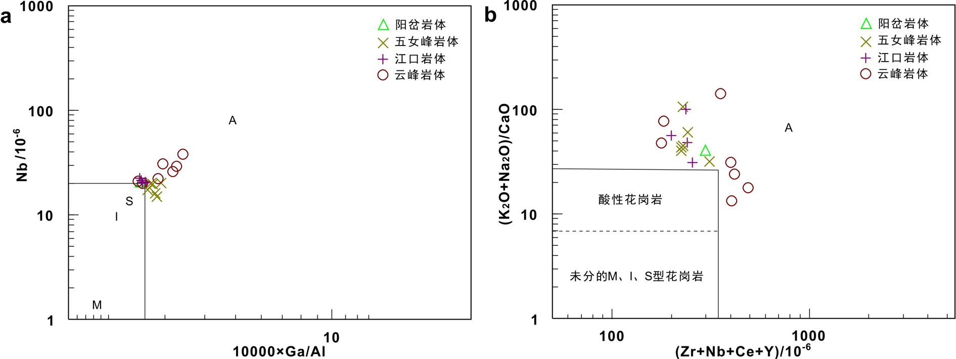 a—阳岔岩体;b—五女峰岩体;c—江口岩体;d—云峰岩体