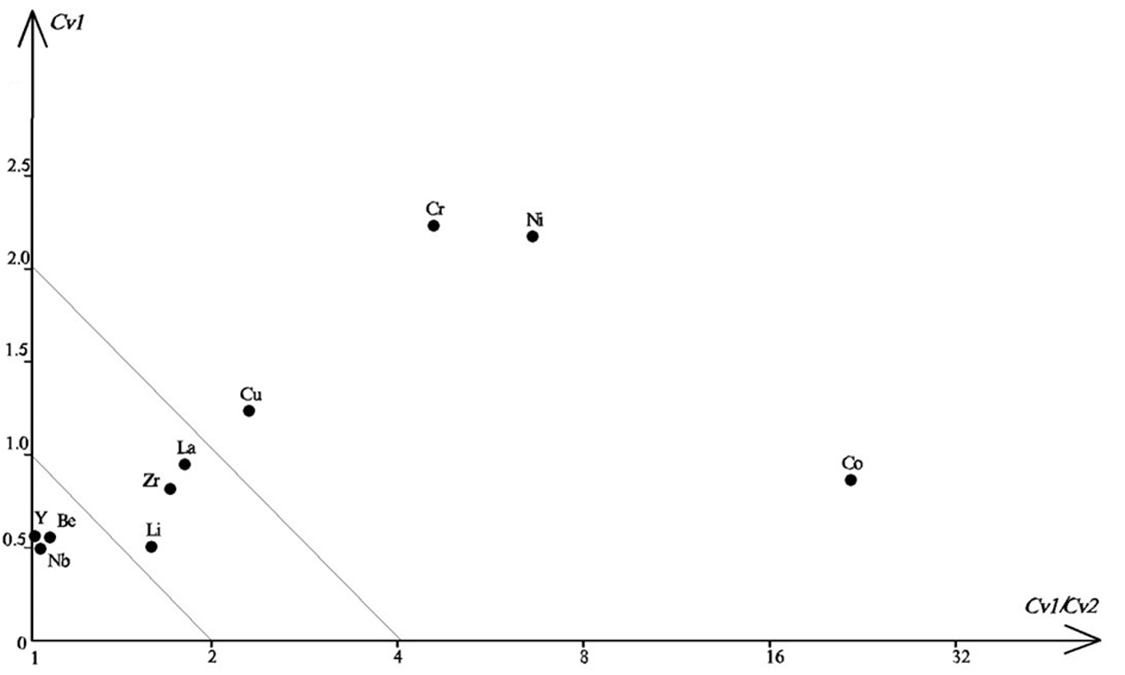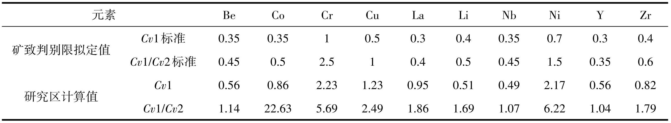 通过研究区原始数据(Cv1)和背景数据变化系数(Cv2)的计算,利用 Cv1 和 Cv1/Cv2 制作变化系数图(赵立志等,2018)来讨论两群数据集的离散程度。用标准化方差双指标矿致判别方式探讨各元素成矿可能,由表2可知:参与讨论的 10 种元素均为双指标达标,说明上述元素均有富集成矿潜力,此类元素在研究区内均具有局部富集且成矿可能,由图2可知,上述元素成矿潜力由大到小顺序为Cr-Ni-Co-Cu>La-Zr-Li>Y-Be-Nb,且均位于较高区间内,说明上述元素在研究区内均具有局部富集且成矿可能。