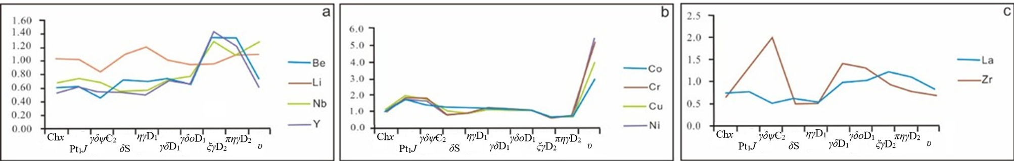 结合元素时空分布特征及本次研究重点认为,研究区主要分为 3 组元素组合:Co、Cu、Cr、Ni;Be、 Nb、Y、Li;La、Zr组合。