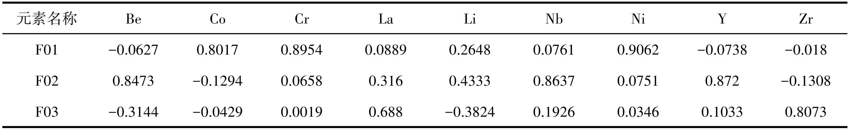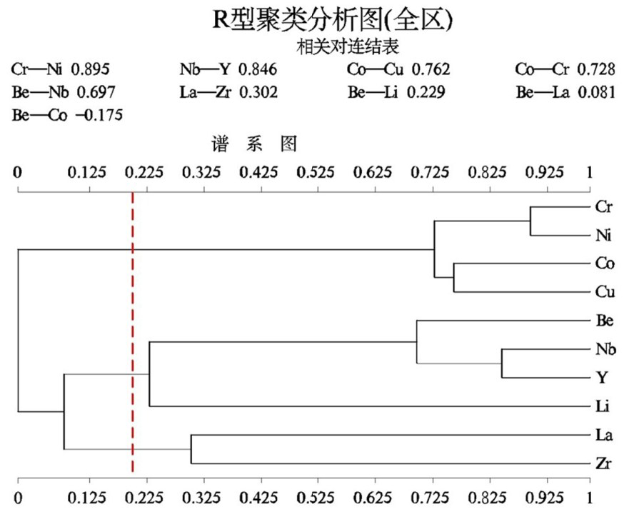 (2)多元统计分析显示了研究区10种元素可分为 Co-Cu-Cr-Ni、Be-Nb-Y-Li 及 La-Zr 共 3 组元素组合。