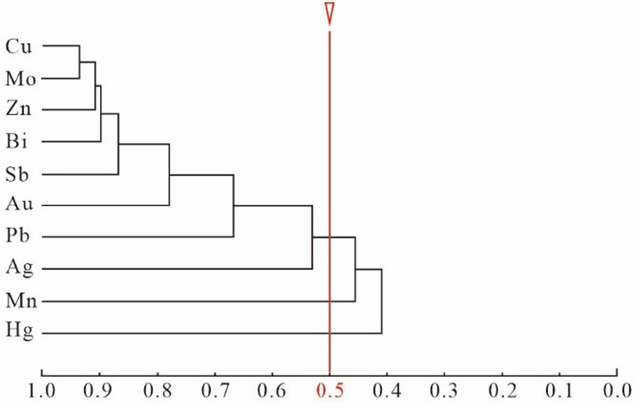 由土壤地球化学测量元素R型聚类谱系图可知 (阳正熙等,2008;梁鸣等,2023;袁征等,2023),当相关系数为 0.5 时,研究区内 10 种元素可分为 3 组 (图3):第一组Ag、Pb、Au、Sb、Bi、Zn、Mo、Cu,为一套以中—低温为主的元素组合;第二组 Mn 和第三组 Hg,均为低温元素。其中第一组 Ag、Pb、Au、Sb、Bi、 Zn、Mo、Cu 指示的以中低温热液为主,有少量的高温热液活动的成矿环境特征,结合这些元素之间相关性较强,再次佐证了研究区铅锌多金属矿成矿受中—低温热液活动影响,Au、Ag、Cu 等元素异常组合可作为寻找铅锌多金属的地球化学标志,以及寻找铅锌矿的间接标志。