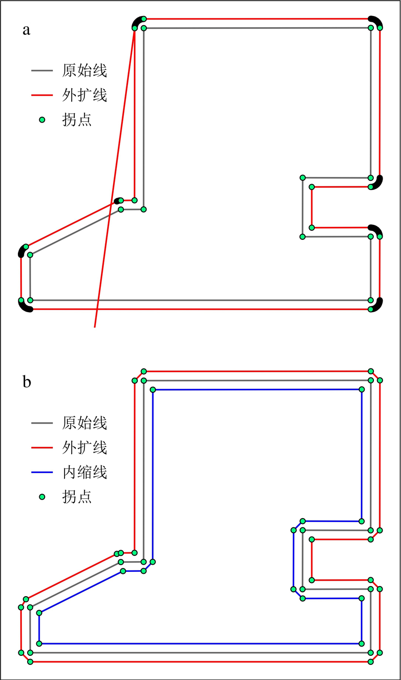 建立在微扩边多边形文件的基础上的对测网文件截断并取得坐标是可行的,微扩边文件同样使用 spatial 模块计算,然而遗憾的是该模块用于计算缓冲区的-Sb 选项同样存在瑕疵,计算复杂多边形的缓冲区会出现飞点(图6a),虽然可以通过手工去除,但不利于脚本连贯运行。GMT 引入了 GDAL/ OGR 开源库,以 ogr2ogr 模块的形式使用,如二者的 implify 模块同样基于 Douglas-Peucker 算法,处理结果相当,可以利用 ogr2ogr 模块中的 st_buffer 函数完成缓冲区的计算,代码如下: