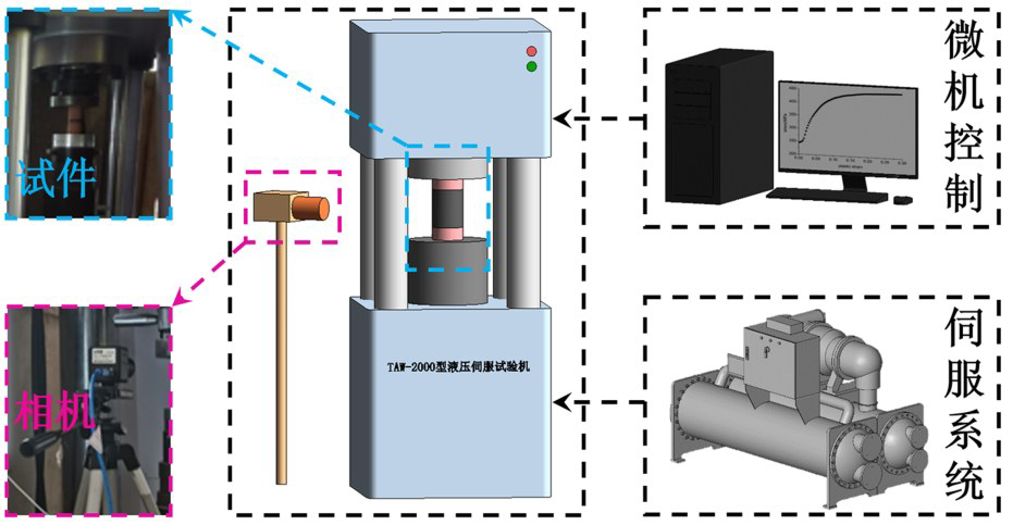 单轴压缩试验中,采用辽宁工程技术大学的 TAW-2000 型液压伺服试验机,该试验机主要由微机控制系统、液压伺服系统组成,为自下而上加载方式,试验前将加载盘调制于水平状态,试件置于试验机上下加载台中心线位置,保证试件均匀受力。通过下部加载台调整煤岩组合体初始高度,布设一台工业相机辅助拍摄煤岩组合体的破坏过程。试验中以轴向变形 0.15 mm/min 的速度施加压缩荷载,微机控制系统自动采集应力、应变数据值,直至试件破坏;工业相机记录试件加载过程中的宏观破坏变形图像,并捕捉试验损伤破坏过程。不同煤层厚度煤岩组合体单轴压缩试验系统原理及试验情况如图2所示。
