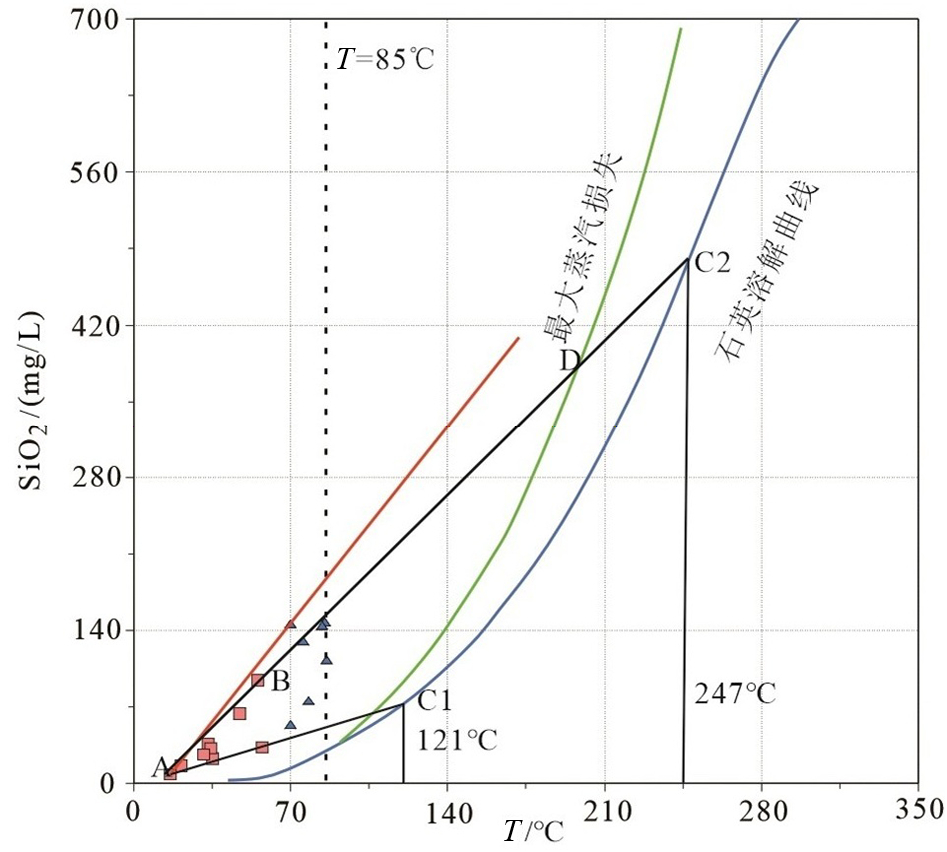 地热水从深部热储上移的过程中可能与浅层地下水或者其他类型的地下水发生混合反应,使地热水中的化学组分发生变化,同时使得地热水水温降低。可以利用硅-焓图解进一步得出深部热储温度和冷水的混入比例系数(Fournier,1977)。该方法是假设在混合之前或之后不存在二氧化硅沉积,并且石英决定二氧化硅在热水中的溶解度。如图8所示研究区热储温度 121~247℃,冷水混合比例 60%~70%。去除冷水混入计算的热储温度与氯-焓图解计算得到的母地热流体的温度一致。