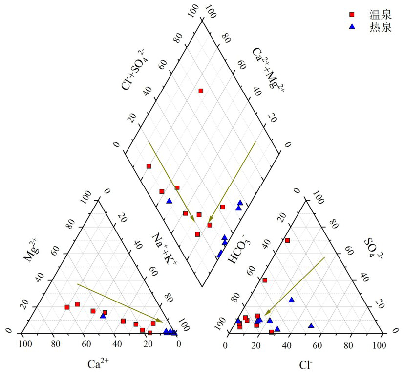 研究区地热水主要的阳离子趋向于 Na+ 增加的方向,阴离子趋向于HCO3- 增加的方向,这与三线图表现出的特征相同,表明地热水可能经历了深层钠长石水解,或与浅层低矿化度的冷水混合。由于温泉出露多在地形起伏的山区,地下水多分布于山前地带,由于研究区海拔较高,气候条件使得冰雪融水成为研究区主要的补给水源,其次是大气降水的补给。温泉在上升过程中会得到水源的补给,因此,区内地热水在与补给水源混合后,原始水化学类型受到稀释或均一化作用,导致不同地热水表现出相似的水化学类型。