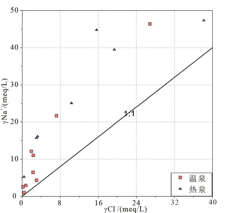 γ(Na+)/γ(Cl-)系数表征地层封闭性和变质系数。若水样点的 γ(Na+)/γ(Cl-)系数大于 1,则表示水体中 Na+ 来源与硅酸盐岩的溶解有关(孙红丽等, 2015)。如图3所示,地热水点都分布在 1∶1的曲线上方,这表明地热水封闭条件相对较好,Na+ 主要来源于硅酸盐矿物的溶滤作用。