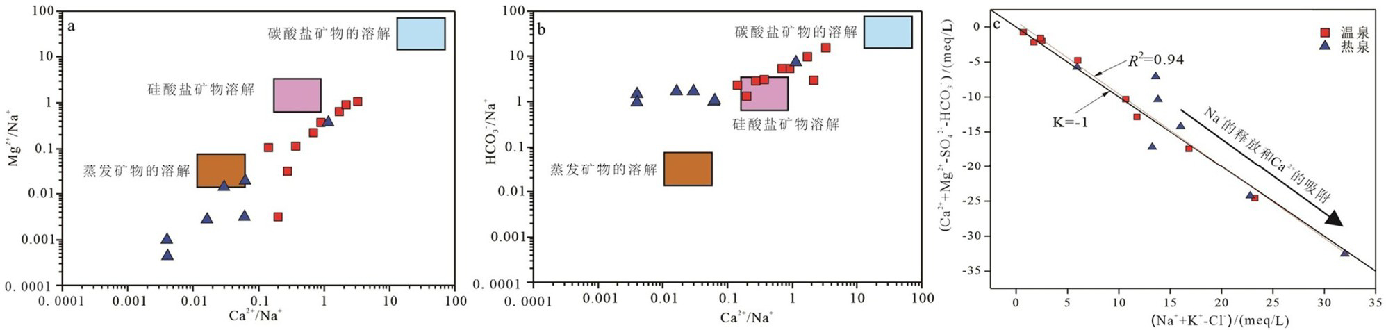 水岩反应的形式主要是蒸发岩、硅酸盐以及碳酸盐矿物风化的溶解。可以通过 Mg2+ /Na+(图5a)、 HCO3- /Na+(图5b)和Ca2+ /Na+ 评估地热水主要风化作用(郑茹丹等,2024)。热泉位于硅酸矿物溶解区和蒸发矿物溶解区之间,温泉位于硅酸矿物溶解区附近。此外,地热水中(Na+ +K+-Cl-)/(Ca2+ +Mg2+-SO42--HCO3-)(图5c)比值接近 1∶1 趋势线,表明地热水发生了阳离子交换反应,即Na+ 含量增加,Ca2+ 和Mg2+ 含量减少。从上文分析可得,研究区地热水流经路径较短,循环速度较快,故表明区内地热水蒸发矿物溶解作用不强烈,因此可以推断区内地热水的主要控制因素是硅酸盐矿物的非全等溶解(韩思航,2022)。