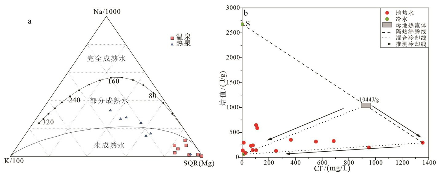 图6研究区水样点Na-K-Mg三角图(a)和氯-焓图解(b)