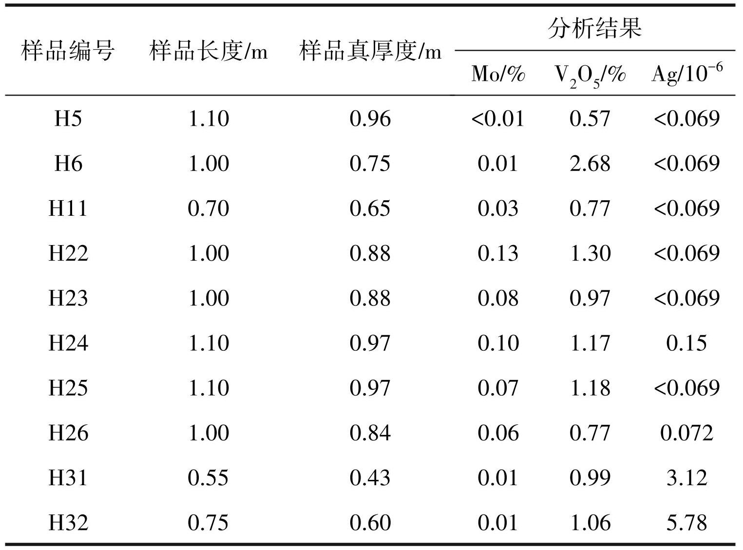 在AP-3异常施工的槽探中(图6),区内银、钒、钼矿属于伴生关系,以钒矿为主,银钼伴生于钒矿中。样品 H5~H6 连续见矿,矿体产状 160°∠70°,真厚度 1.71 m,V2O5的品位分别为 0.57% 和 2.68%(表6),未见银钼矿化;H11 揭露的矿(化)体产状 158° ∠74°,真厚度 0.65 m,V2O5的品位达 0.77%,伴生钼元素的品位也达到了 0.03%;样品 H22、H23、H24、 H25、H26、H31、H32 连续见矿,矿体产状为 155° ∠85°,真厚度5.57 m,V2O5的品位为0.77%~1.3%,伴生钼元素的品位为 0.01%~0.13%,伴生银元素的品位最高5.78×10-6。