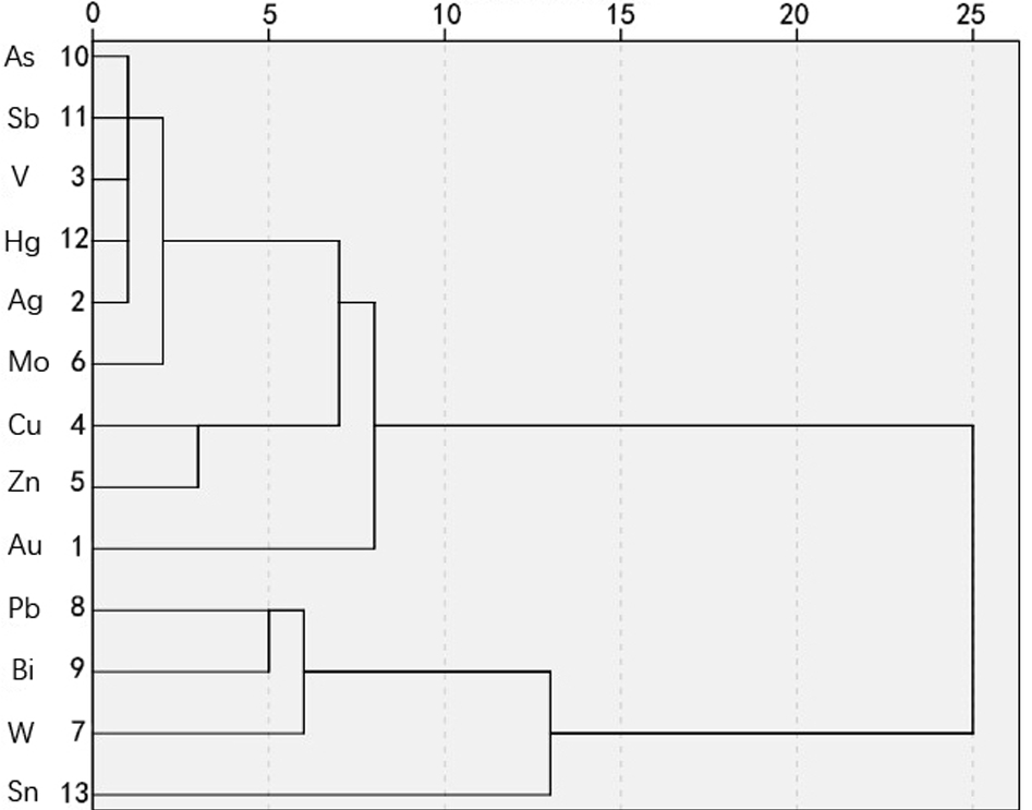 为了探索研究区内各元素间的联系,对13种成矿元素进行相关分析和 R 型聚类分析,用以探究研究区中各元素分布规律和彼此间组合特征(杨帆等,2011;于俊博等,2014;刘邦定等,2015;唐卫东等,2023)。