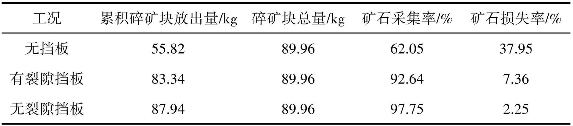 将试验结束后出矿口放出样进行筛分,对碎矿石进行称量。不同工况下放矿量详情见表4所示。在无挡板、有裂隙挡板和无裂隙挡板条件下,碎矿石的贫化度分别达到 37.95%、7.36% 和 2.25%。有裂隙挡板和无裂隙挡板对于碎矿石的贫化度有着明显的控制作用,这是由于挡板能够有效抑制上部冰碛物细颗粒向下运移,大大降低细颗粒的穿流效应,致使冰碛物混入碎矿层的含量下降,从而降低矿石的贫化程度。而有裂隙的挡板其阻隔细颗粒下移的效果低于无裂隙挡板,仍有少部分细颗粒可以通过挡板裂隙向下迁移混入碎矿层,从而提高矿石贫化度。