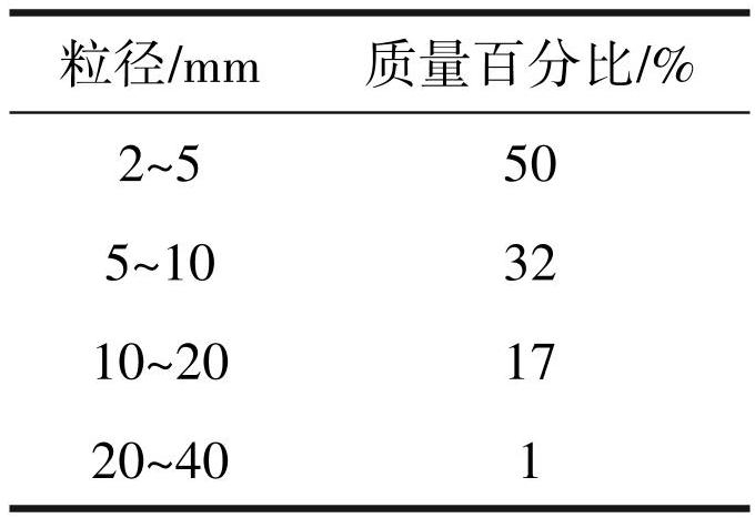 试验中矿块为中风化、微风化状石英二长斑岩崩落碎块石,石英二长斑岩属坚硬岩,属碎石土,碎块粒径平均 0.83 m,呈松散—稍密状态。基于矿山井下崩落碎矿石块度调查与统计可得:该矿自然崩落碎矿石块度小于 2 m3 的占总体 99% 以上,其块度大小范围为 0.5~3.5 m3。假设碎矿块为球体时,碎矿石直径范围为 0.692~1.83 m,矿石直径小于 1.38 m的占99%。在放矿口处,直径大于1.2 m的大矿块质量占比在碎矿块总重量的 2.19%~38.67%,平均值为 20%,崩落碎矿块的最大直径和最小直径分别为 3.2 m、2 mm。因此,试验模拟崩落碎矿块粒径取值简化为:直径大于 1.2 m 碎矿块质量占比为 20%,最小碎矿块粒径为2 mm,最大碎矿块粒径为3.2 m。