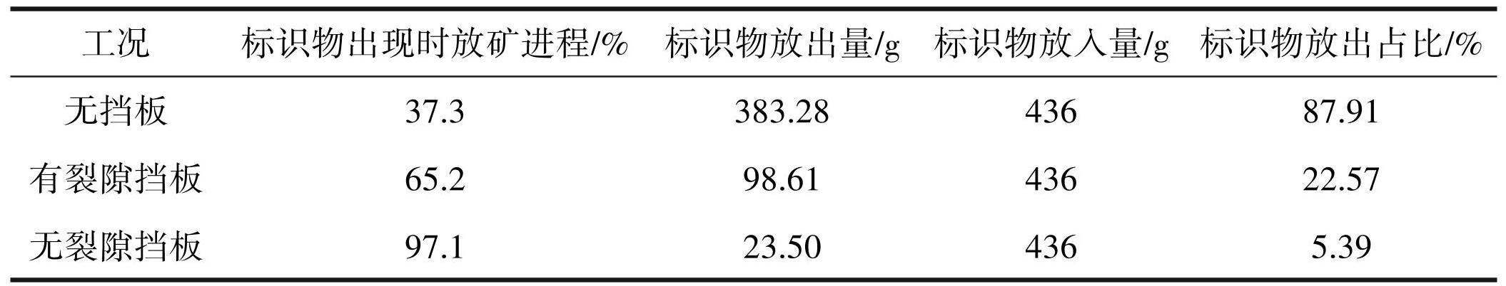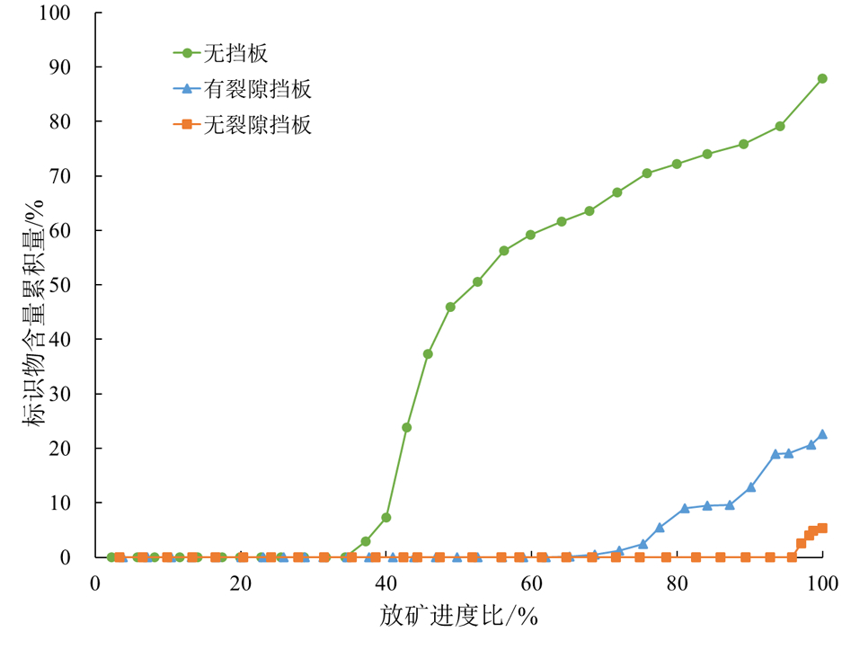 由图6及表3可知:无挡板情况下标识物出现时间最早,在放矿进程达到 37.3% 时就有标识物从放矿口放出;有裂隙挡板情况下标识物出现时间次之,在放矿进程达到65.2%时出现;无裂隙挡板情况下标识物出现时间最晚,在放矿进程达到 97.1% 时出现。且标识物放出质量占比由大到小依次表现为:无挡板条件>有裂隙挡板条件>无裂隙挡板条件。结合上述试验现象可以得出:当无挡板时,随着放矿的进行试验箱内会逐渐形成自下而上的移动漏斗,上部冰碛物及标识物将顺着移动漏斗向放矿口运移,从图6中可以看出,无挡板条件下标识物含量曲线变化前期斜率很大,这说明这段时期由于移动漏斗的形成大量细颗粒向下运移并汇聚,这给井下泥石流的发生提供了丰富的物源条件,而有裂隙挡板和无裂隙挡板条件下,仅有 22.57% 和 5.39% 的标识物通过挡板运移至放矿口,且标识物含量曲线变化平缓,可以得出挡板能够抑制上部冰碛土细颗粒向下运移,降低细颗粒在碎矿层的汇聚规模,有效控制井下泥石流发生的物源条件,从而预防井下泥石流灾害的发生。