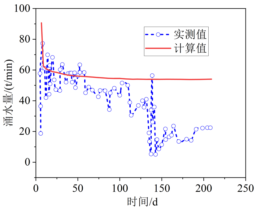 根据开挖后太子山隧道涌水量观测统计,在 DK124+882 隧道进口上台阶左边墙拱脚处存在大型溶洞和地下暗河含水层,施工期间出现涌水和渗水现象,属于典型地下暗河型突水。现场采用物探对溶洞形态和尺寸进行初步测量,测得该含水层宽约2.5 m,深度13~16 m,与开挖方向同向斜交,与水平方向的夹角约为 80°。根据钻探地质报告,渗流压力约为 5.5 MPa,渗透系数约为 2×10-4 m/s。根据以上参数得到预测涌水量与实测涌水量的对比。结果表明(图14),涌水量随时间变化计算值与实测值具有相同规律,其中计算瞬时涌水量为 92 t/d,大于实测值 83 t/d。这是因为实测数据通常具有延迟性。涌水量随时间持续增大至 60 d后,由于溶洞采用灌浆和密封,导致涌水量下降。在 130 d后,涌水量明显下降到 20 t/d。此外,根据 130 d内的实测值和计算值对比发现,由于计算值无法考虑灌浆处理对涌水量的影响,因此,计算值与实测值相对误差会增大。