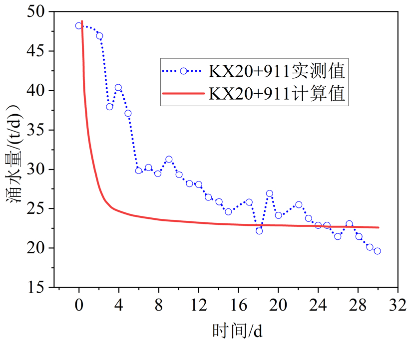图15为新七道梁隧道涌水量实测数据与本文理论计算对比结果。可见理论计算值与实测值具有较高的吻合度。随时间增大,隧道涌水量逐渐趋于稳定。根据实测结果,当涌水时间增大至 10 d 后,隧道涌水量趋于稳定。实测稳定涌水量约为30 t/d,预测稳定涌水量约为 33 t/d,两者相对误差为 10 %,证明本文理论模型是可行的。