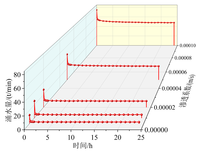 (1)隧道涌水量与含水层渗透系数成正比,随涌水时间增大,初始涌水量显著降低,随后隧道涌水量逐渐趋于稳态。此外,含水层越厚,储水量越大,涌水量达到稳定所需的时间也越长。