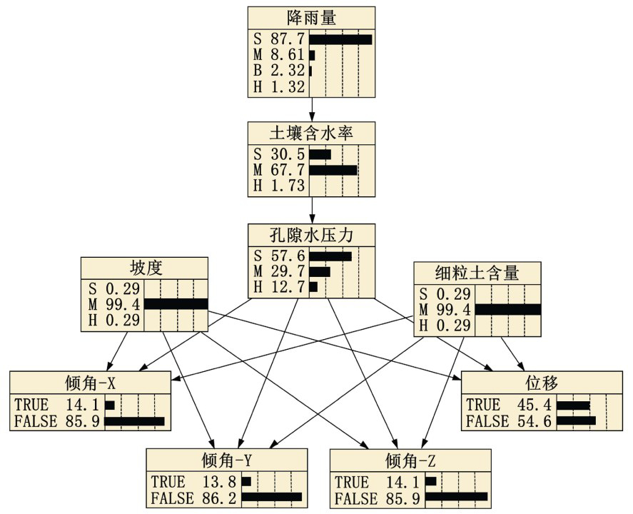 (2)研究结果表明,贝叶斯网络对先验概率要求较低,通过建立数据库进行学习可以达到预测滑坡变形条件概率的目的,对研究区及相似条件区域的滑坡具有一定的适用性,研究成果为滑坡预警研究提供了新思路。