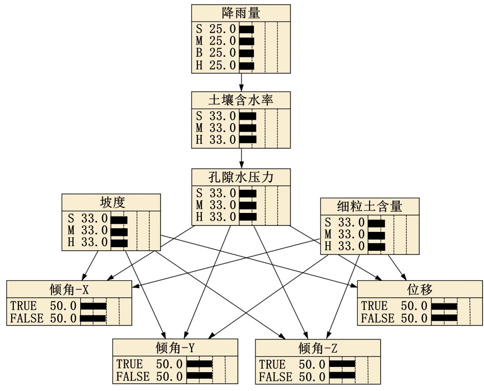 贝叶斯网络的概念由 Judea Pearl 在 1985 年提出,是一种图形模型,用概率描述节点变量之间关系,这种模型既是有向无环图模型,也是概率图模型 (张孟帅,2019)。贝叶斯网络用图像描述数据间的相互关系具有较强达到逻辑性,语义清晰更易于理解,这使得贝叶斯网络更适合在缺少数据的中小型工程中应用(Alireza et al.,2019;Yang et al.,2019;陈雪龙和姜坤,2021)。张润川等(2023)提取灾害链成因中关键节点,构建了福建省台风暴雨灾害链的动态贝叶斯网络模型,预测结果可信度较高。帅敏等 (2021)以湖南省宁远县暴雨所引起的滑坡为例,构建基于贝叶斯网络的灾害推理模型,预测结果与实际情况基本吻合。姜毅(2020)结合泥石流相关数据构建了贝叶斯网络,根据贝叶斯网络预测结果将灾害经济损失进行货币化表示。总体而言,目前研究集中在暴雨-地质灾害链的推理模型上,采用贝叶斯理论对滑坡进行预警预测的研究还稍显不足。
