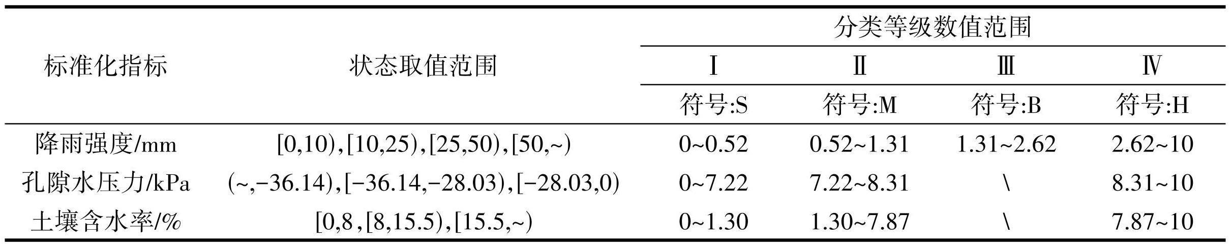 对各标准化后的指标按数值高低进行分级处理以实现离散化。指标分层标准根据自监测系统所设定预警参数以及相关文献所确定,并代入式 (1)进行标准化处理,扩大 10 倍后所得结果如表1所示。