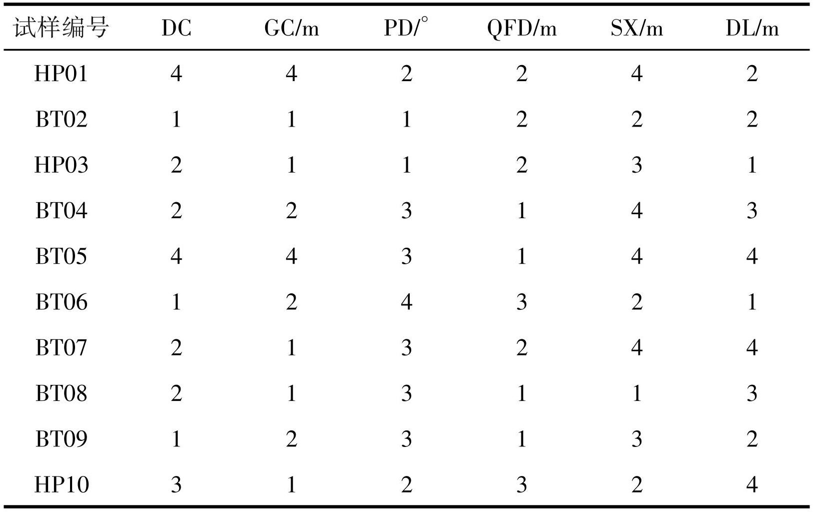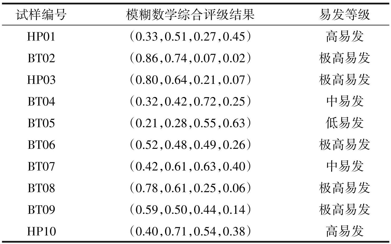 基于上述评价范围分析,选取准确率更高的廊道沿线评价区研究。首先,利用GIS空间分析,选取具有代表性的 10 个采样点,统计 7 项试样指标(表4),结合上述相关标准与规范制定离散规则(表5),随后对统计的试验数据进行离散,所得结果如表7所示。