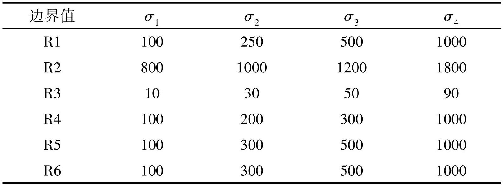 式(8)中,I1,I2,I3,I4分别代表被评价对象的低、中、高、极高易发等级隶属度;σ 为被评价对象实测值;σ1,σ2,σ3,σ4分别代表评价对象的界限值。