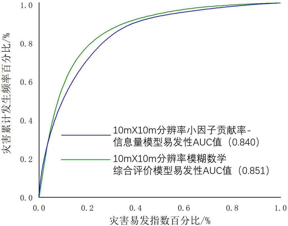 ①地质灾害评价范围与因子优化分析。首先,确定谋道-建南线性廊道区评价因子集,计算因子敏感性,利用贡献率-信息量模型分析 30 m×30 m、 10 m×10 m与5 m×5 m栅格单元分辨率下的易发性,并通过ROC验证得优势评价单元。其次,结合所得优势评价单元,沿线1000 m缓冲评价区分别使用线性廊道区评价因子集和沿线缓冲评价区因子进行敏感性分析,利用贡献率-信息量耦合模型计算易发性,ROC验证得适宜评价范围及评价因子。②地质灾害评价模型分析。基于评价范围研究,结合粗糙集理论,分析相关因素对应敏感性,进而构建模糊数学综合评价模型,通过成功率曲线验证,分析廊道区基于粗糙集理论的模糊数学综合评价模型、贡献率-信息量模型准确度。