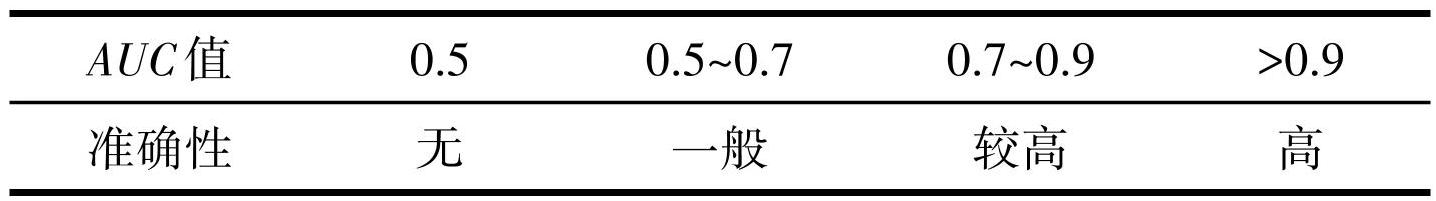 ROC 曲线是一种广泛用于地质灾害评价的精度验证曲线。该曲线分别以信息量值由高到低区域面积累计百分比和样本点累计百分比做横轴和纵轴。曲线线下面积越大,表明预测结果准确度越高。AUC值与准确性对照如表2所示: