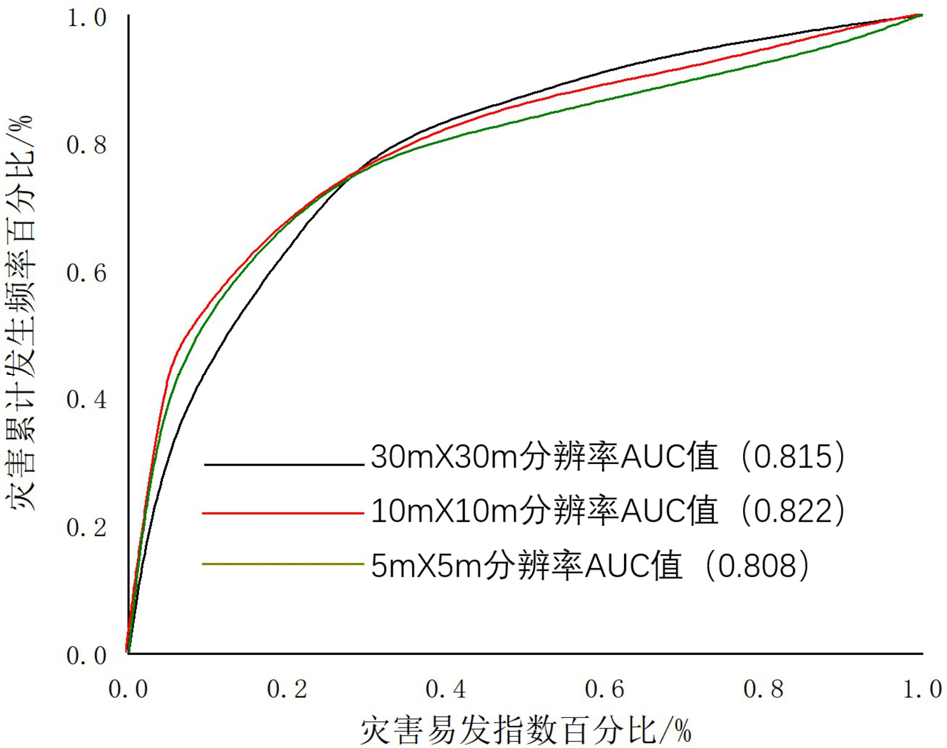 由表1及 ROC 曲线结果显示:谋道—建南道路管线线性廊道区因子敏感性:地层>道路>坡度>曲率 >湿度 >坡向,且地层、道路、坡度因子占比 58.2%,与曲率、湿度、坡向因子权值差距较大;线性廊道区贡献率-信息量耦合模型评价易发结果:10 m×10 m分辨率下AUC值(0.822)>30 m×30 m分辨率下 AUC 值(0.815)>5 m×5 m 分辨率下 AUC 值 (0.788)。因此,评价结果与分辨率非线性相关,低分辨率与高分辨率对真实地貌信息及环境因子属性特征的弱化均使准确度低,而 10 m×10 m 分辨率下廊道区易发性评价所得结果准确度最高,为优势评价单元。