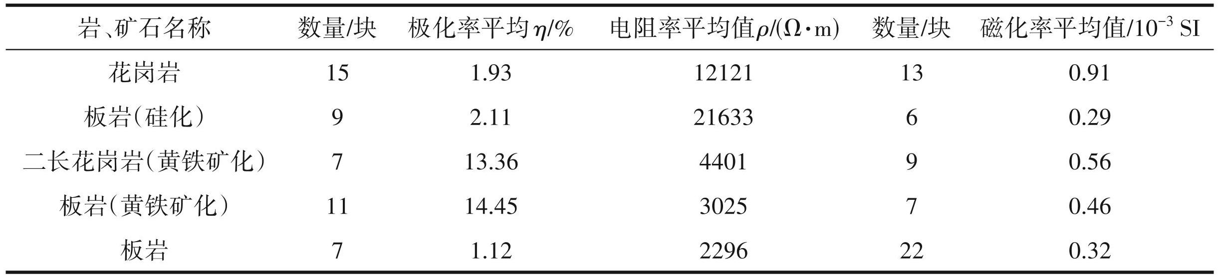 对矿区内具有代表性的岩(矿)石进行电、磁性参数测定(表1)。测试结果表明:硅化岩(矿)石电阻率最高,花岗岩类电阻率次之,板岩电阻率最低。当地层和岩体中富含黄铁矿时,呈现高极化率特征;黄铁矿化不发育则呈现低极化率特征。印支期花岗岩磁化率最高,海西期黑云二长花岗岩磁化率次之,板岩磁化率最低,其中硫化物含量较高的地质体磁化率相对正常地质体磁化率较高。本区主要岩(矿)石存在明显的物性差异,为本区物探工作的开展提供了地球物理前提。