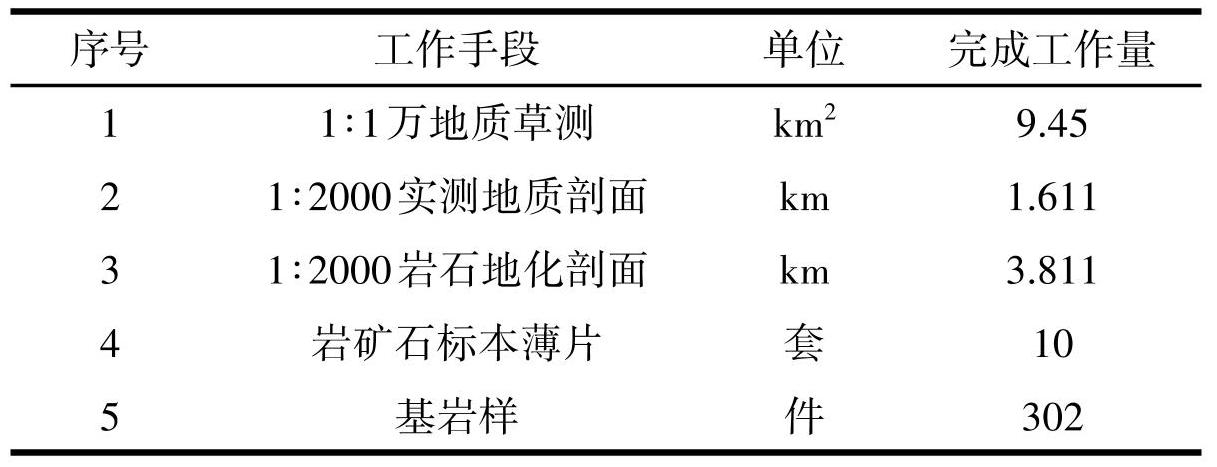 异常查证工作方法主要为大比例尺(1∶10000) 地质草测、地质、地化剖面测量和槽探工程揭露等,完成主要实物工作量见表6。