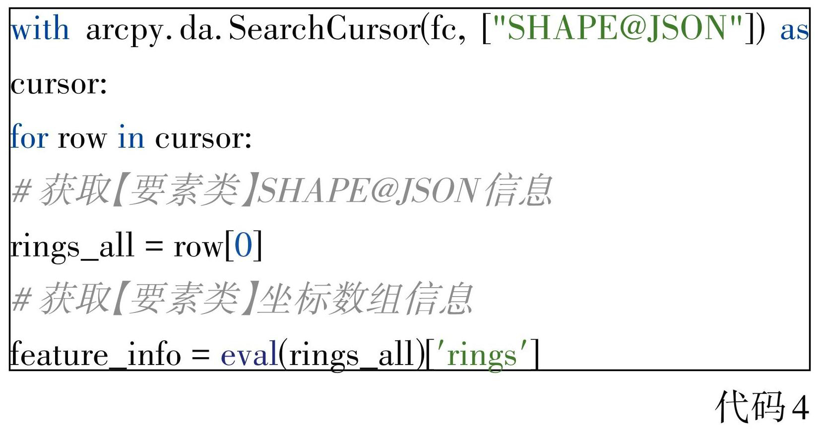 使用 Python 读取 ArcGIS 要素类的方式有很多,最灵活高效的是使用 SearchCursor游标读取(ArcGIS 官网,2024b),如代码4,fc变量为要素类路径,该游标可直接读取要素的GeoJson字符串,从中提取拐点坐标,Json中拐点坐标位于rings属性内,该属性为多维数组,其格式与代码2中feature_info变量格式一致。