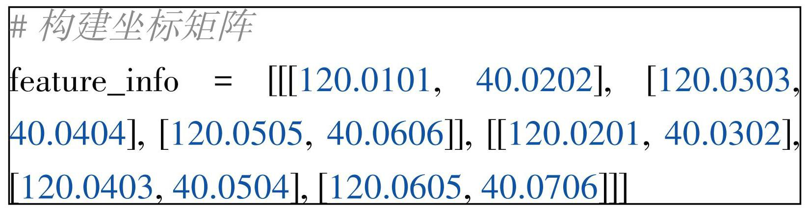 ArcGIS 要素中,存放的是几何实体,使用代码 2,将坐标矩阵转换为ArcGIS的面对象(Polygon),其中坐标矩阵 feature_info 是三维数组,第一维代表几何,第二维代表部件,第三维代表坐标。arcpy.Poly‐ gon 是构建面对象的核心方法,其中 WKID 为 4490 (ArcGIS 官网,2024a)的投影方式对应国家 2000 大地坐标系(GCS_China_Geodetic_Coordinate_System_2000)。
