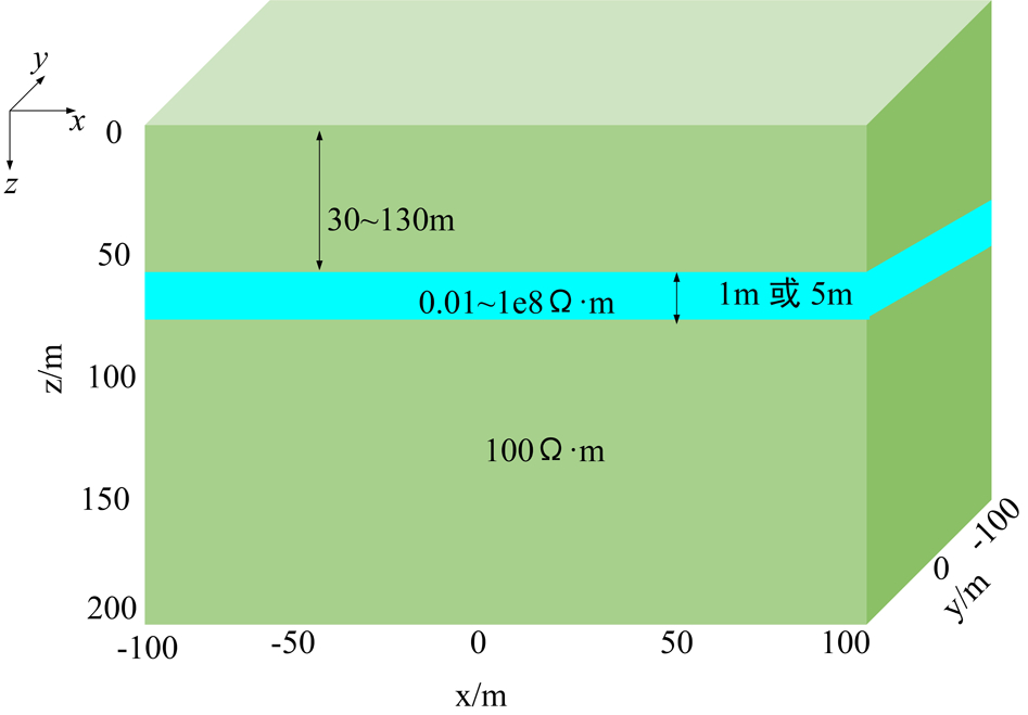 基于上述采空区影响机制及煤层厚度特征,本研究构建了一维地电模型以模拟杆塔下采空区电性特征(图1)。模型设计核心参数如下:目标体埋深为 30~130 m,选取 1 m 和 5 m 两种典型厚度。模型背景电阻率为 100 Ω·m,目标体贯穿于整个模型中,电阻率为10-2~108 Ω·m。