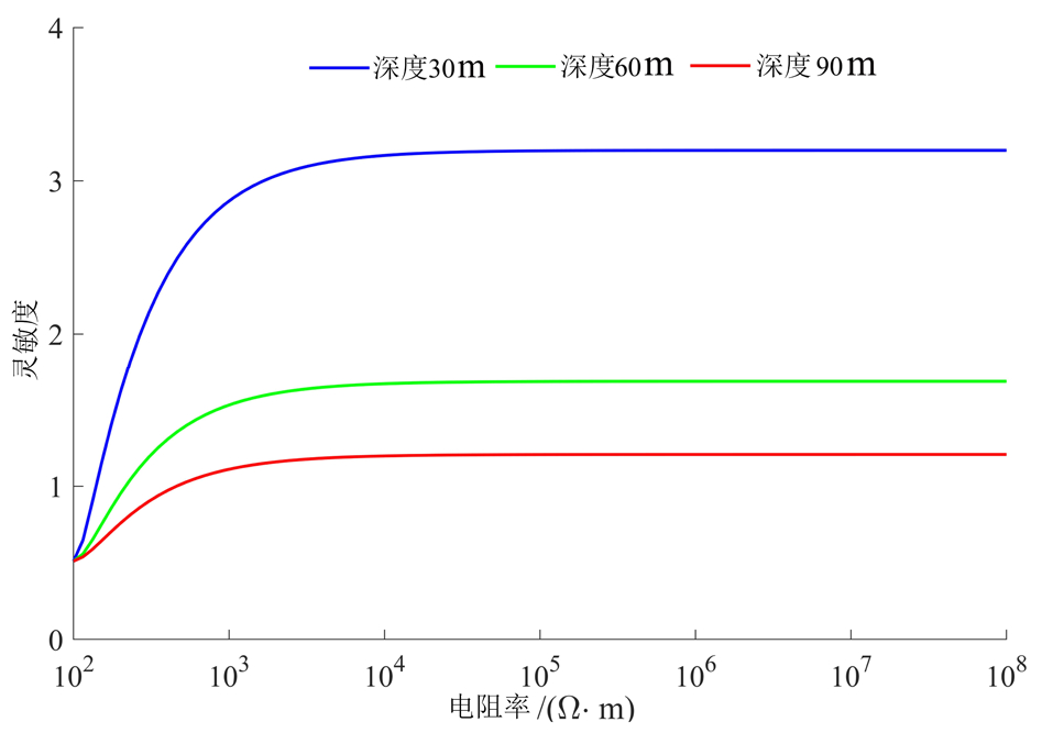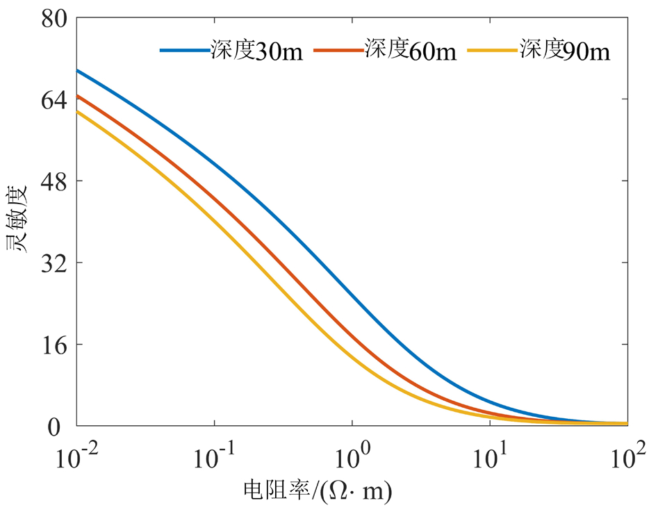 灵敏度随深度变化的结果如图5所示。图中绘制了3种不同埋深(30 m、60 m、90 m)下灵敏度值随电阻率变化的曲线。从结果可以看出,在相同电阻率条件下,埋深为 30 m 时灵敏度值最大,随着埋深增加 60 m 和 90 m,对应灵敏度值逐渐减小。同时,对于固定埋深对应的曲线,随着目标体电阻率增大,灵敏度值均逐渐降低,并最终趋于零。该现象表明,当目标体电阻率逐渐接近背景电阻率时,二者之间的电性差异减小,异常响应减弱至无法分辨。总之,在浅埋条件下,即使目标体与围岩之间的电阻率差异较小,仍可产生较明显的异常响应。随着埋深增加,探测能力逐渐减弱。当目标体电阻率逐渐接近背景值,异常响应显著降低。