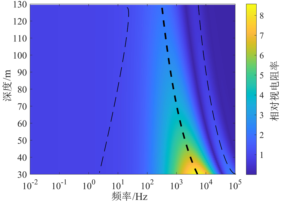 在电磁探测研究中,一维图通常表现单一变量 (如频率或深度)与视电阻率的线性关系,难以全面呈现多参数耦合作用下的异常响应特征。相比之下,二维图通过横纵坐标系统集成双变量分析,可清晰揭示目标体埋深与频率之间规律。针对富水采空区这一典型地球物理场景,目标体设定为电阻率 0.01 Ω·m、厚度 1 m。如图6所示,通过频率与埋深的耦合关系,直观展示了富水采空区在多参数影响下的异常响应,并给出埋深一定时对应的最优频率。