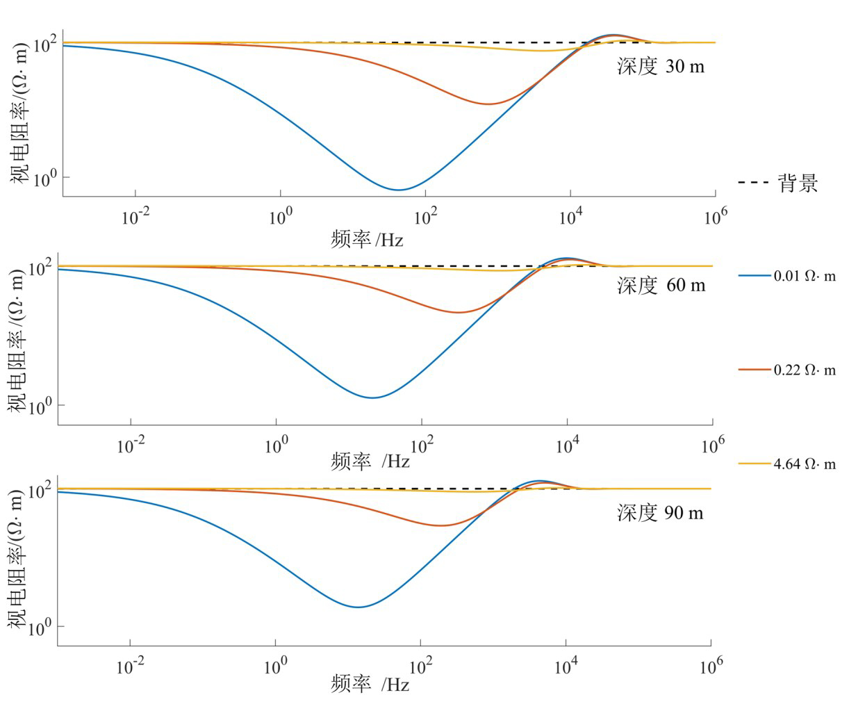 (2)当埋深位于 30 m 时,富水采空区推荐使用频段(10-2~105 Hz)频段,空气采空区推荐使用(102~5×104 Hz)。当埋深位于60 m时,富水采空区推荐使用频段(10-2~104 Hz),空气采空区推荐使用(80~9× 103 Hz)。当埋深位于90 m时,富水采空区推荐使用频段(10-2~5×103 Hz),空气采空区推荐使用 80~5× 103 Hz,这为针对不同埋深目标进行频率探测提供了一定的理论依据。