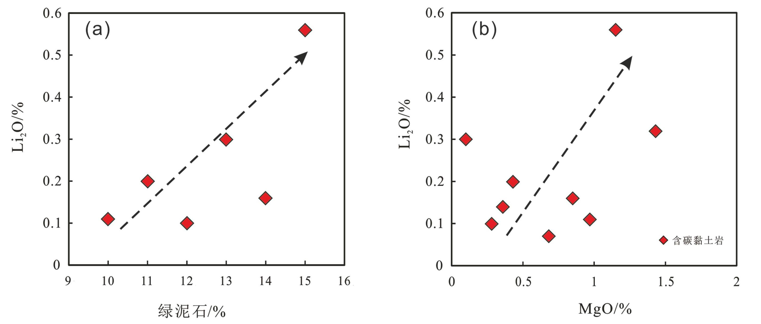 SEM-EDS与 XRD 分析结果显示研究区富锂黏土岩主要黏土矿物为高岭石及绿泥石(表3,图5)。综合分析显示,绿泥石是区内锂富集的主要载体: (1)全岩中Li含量与绿泥石含量大致呈正相关关系 (图8a),Li2O含量较高的样品,绿泥石占比较高(表3,图5);(2)Li2O含量较低的样品,绿泥石占比较低 (图5,表3);(3)这一发现与国内外多个富锂黏土岩矿床的研究结论一致,如:河南上石炭统本溪组铝土矿、桂西平果地区富锂黏土岩中,其黏土矿物以高岭石、伊利石、锂绿泥石为主,其中锂主要赋存于锂绿泥石中(沈丽璞等,1986;宋云华等,1987;凌坤跃等,2021;姚双秋等,2021);滇中下二叠统倒石头组富锂黏土岩中,黏土矿物主要为高岭石与绿泥石,锂含量与绿泥石呈良好的正相关性,表明锂主要赋存于绿泥石中(叶琴等,2023);近期在扬子北缘镇巴地区二叠系梁山组中,也发现了富锂黏土岩,其 SEM-EDS 结果显示其主要黏土矿物为伊利石和绿泥石,其中锂含量与绿泥石呈明显正相关性,与伊利石成负相关性(祁晓鹏等,2025),与本文富锂含炭黏土岩特征相似,进一步指示本研究区内富锂黏土岩锂主要赋存于绿泥石中。此外,本次富锂含炭黏土岩样品中 MgO 与 Li2O 含量呈现出明显正相关关系,或与Mg2+(0.72Å)与Li+(0.76 Å)的半径相近,具相似的化学性质,这与黏土矿物(绿泥石) 晶格发生锂与镁的类质同象替换紧密相关(温汉捷等,2020;凌坤跃等,2021)(图8b),也表明本研究区富锂含炭黏土岩主要赋存于绿泥石中。