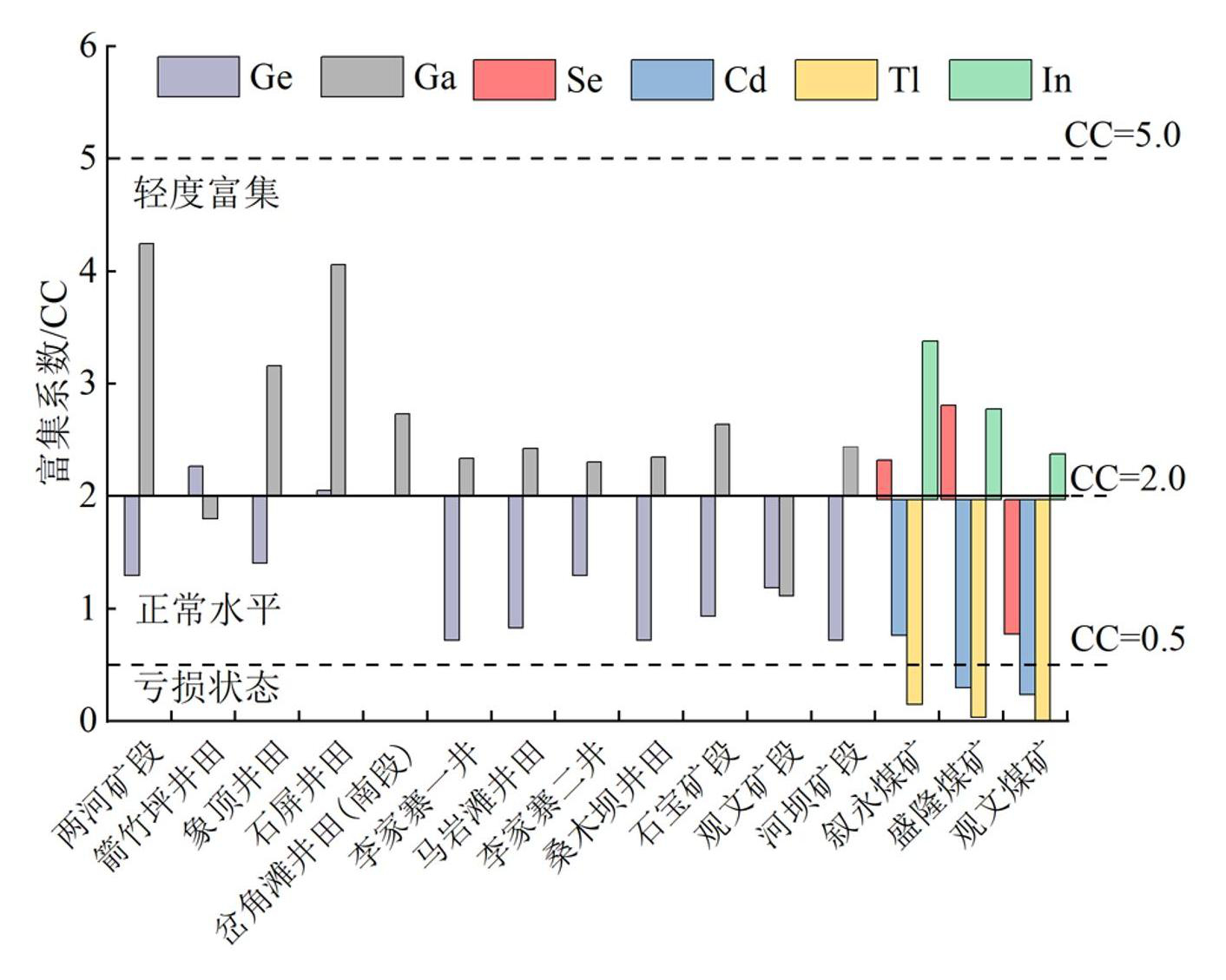 CC=1.1~4.2,普遍轻度富集,仅箭竹坪井田、观文矿段为正常水平;Ge:CC=0.7~2.3,多为正常水平,仅箭竹坪、石屏井田轻度富集;In、Se:多为轻度富集;Cd、Tl:正常水平或亏损。