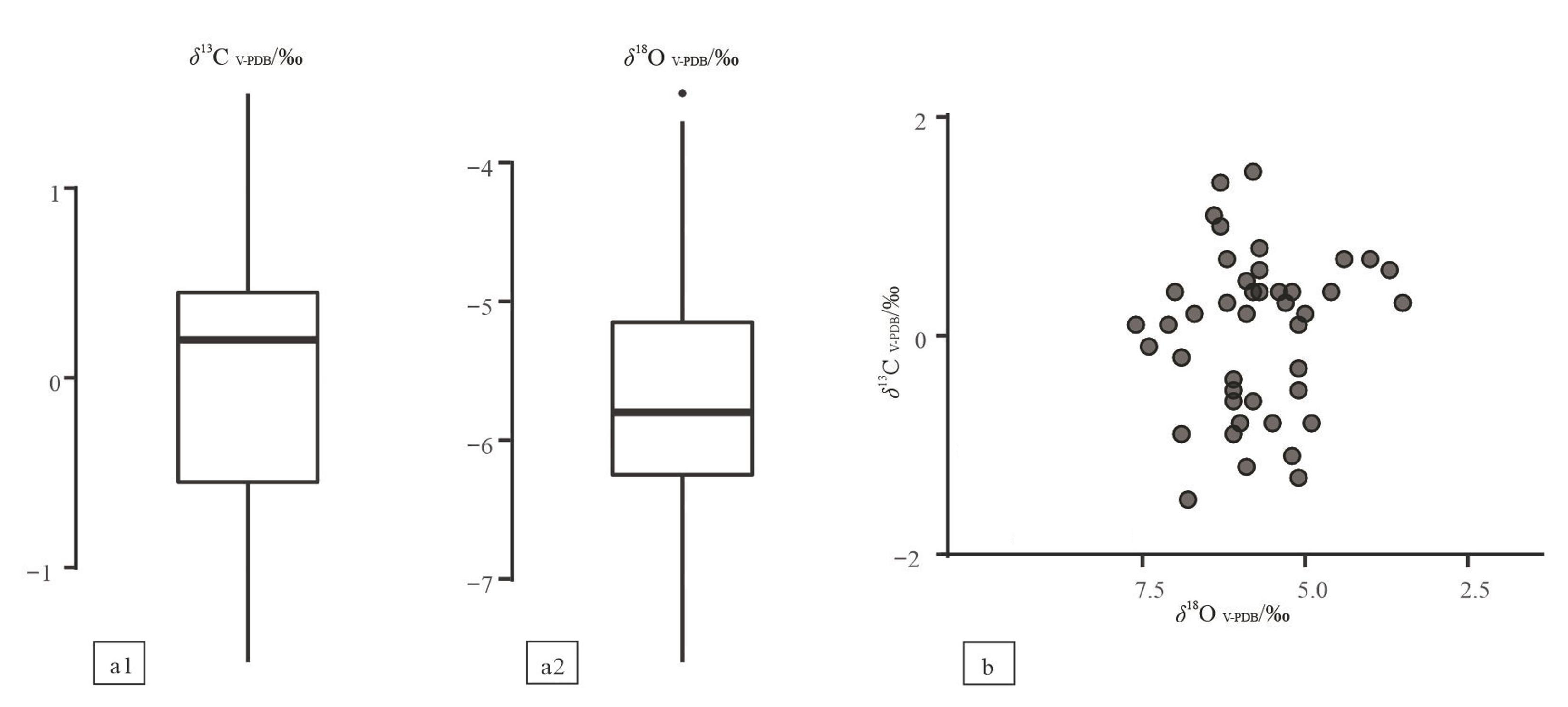 a1—三山子组δ13C值分布特征;a2—三山子组δ18O值分布特征;b—δ13C、δ18O值相关性判别