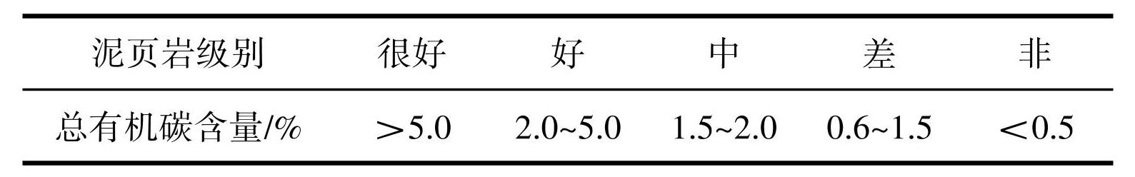 研究区内马东山组主要为暗色湖相泥页岩(包括泥页岩类),其泥岩有机质类型多为腐殖型,因此以湖相暗色泥岩总有机碳评价标准评价泥页岩级别(表1)。