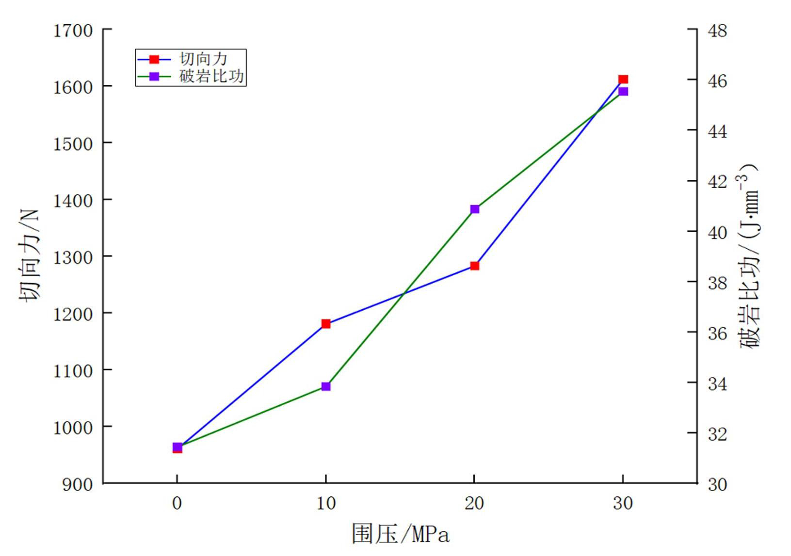 图12破岩比功和切向力与围压关系曲线