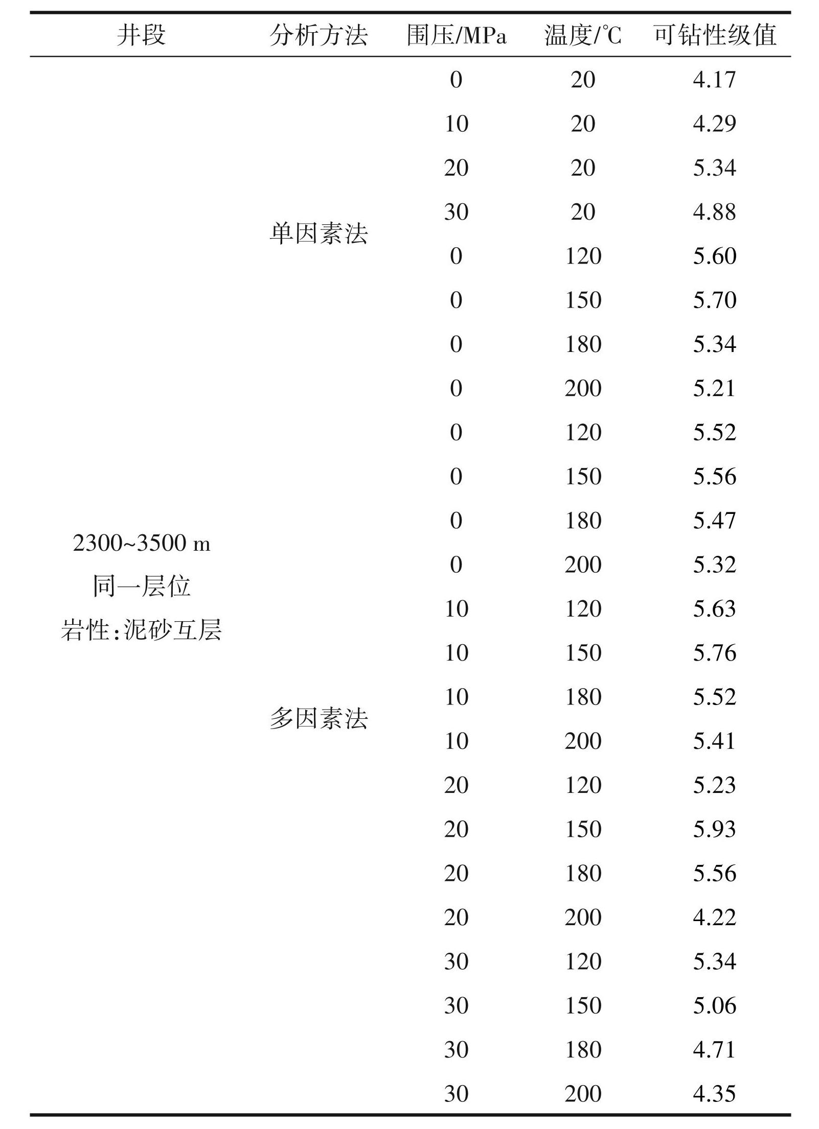 仅考虑温度变化情况(图3),随着温度的升高,可钻性级值呈减小趋势。有学者研究表明(范利丹等,2022;纪慧等,2022;Cheng et al.,2024),砂泥岩由于存在使岩石发生热裂纹的临界温度,砂泥岩的临界温度在180℃左右,当低于该温度时,岩石性质随温度变化较小;当高于该温度时,岩石产生热裂纹,杨氏模量明显降低,岩石强度降低,可钻性级值降低。