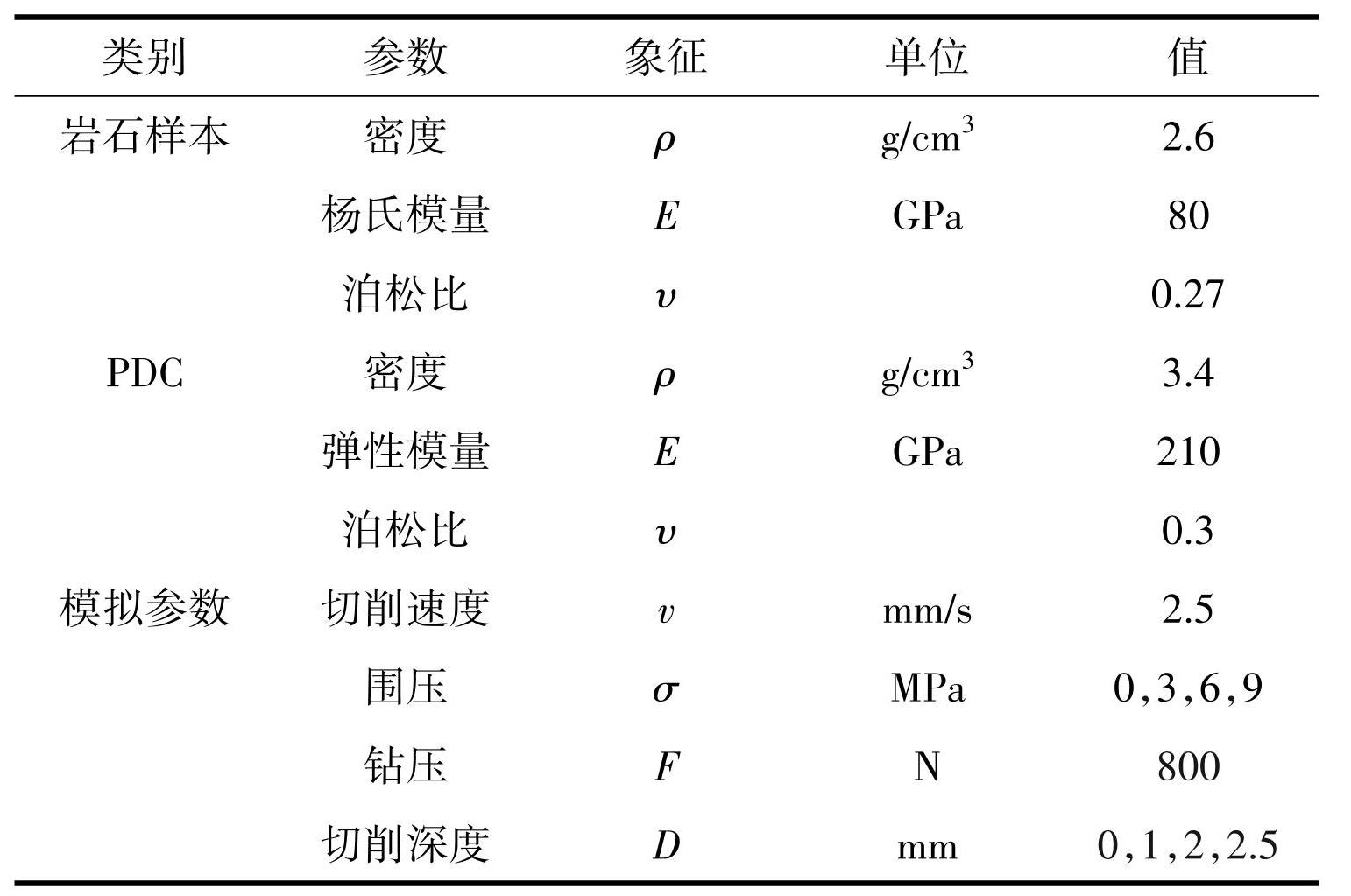 数值模型构建,选取仿真模拟切削效率最高的后倾角 25°减小模拟误差的影响,提高模拟精度(纪慧等,2022),在 120℃地层温度条件下建立仿真架构。模型底部实施全约束边界条件,顶部施加静水压力并施加侧向约束耦合。将钻头旋转运动转化为等效线性位移边界条件,施加轴向钻压 800 N。采用变密度网格划分策略:齿-岩接触区加密至 0.1 mm 单元尺寸,外围区域扩展至 1 mm。岩体本构参数及工况设置数据如表2所示。