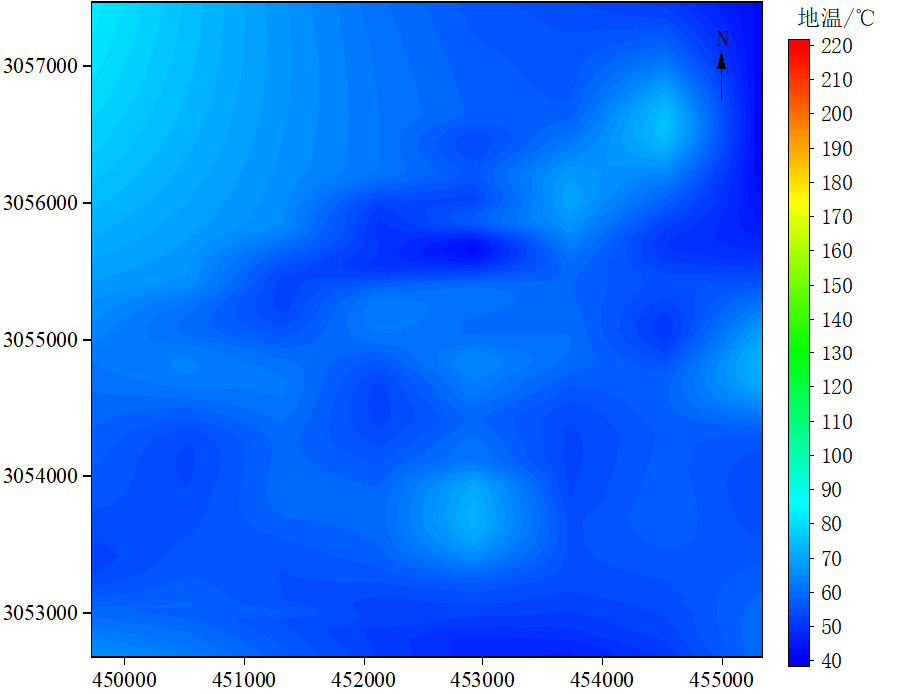 地层深部温度估算在地质与能源等多领域意义重大。从地质研究角度看,有助于深入理解地球内部热状态、热演化过程以及深部地质构造的动力学机制;在能源勘探开发方面,准确估算深部地层温度是评估和开发地热能、油气资源的关键前提,合理的温度预测能够有效指导地热井的布局与开采方案制定,助力提升地热能开采效率。其估算方法通常用地温梯度法与一维稳态热传导方程法(朱戈等, 2020),本文采用地温梯度法对矿区 1500~4500 m地层温度进行估算,并作出温度分布图(图8~图11),其中,1500 m处地层温度范围为47.97~74.11℃,2500 m 处温度范围为67.18~116.66℃,3500 m处温度范围为 85.61~161.97℃,4500 m 时温度范围为 104.04~207.27℃。显然随着深度增加,地层温度呈上升趋势,由此说明埋深对地温度场有着一定的影响。