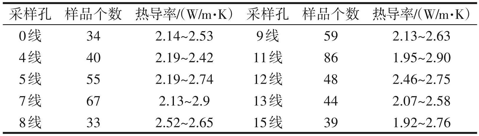 岩石热导率作为材料科学与热力学领域的核心概念,不仅能够量化物质传导热量的能力,更是计算大地热流值不可或缺的关键数据。为了科学、准确地评价研究区地层岩石的热传导性能,本研究开展了岩石热导率样品的采集与测试工作。样品采集范围主要来源0线、4线、5线、7线、8线、9线、10 线、11 线、12 线、13 线、15 线中 66 个钻孔,共计 505 个岩石样品,包含的主要岩石类型有灰岩、粉砂岩;测试工作采用 DRPL-Ⅲ导热系数测试仪完成(图5),参考标准 GB/T10295-2008,基于稳态热传导定律,运用平板热流计法对研究区域内采取的岩石进行热导率测试,测试结果见表2。