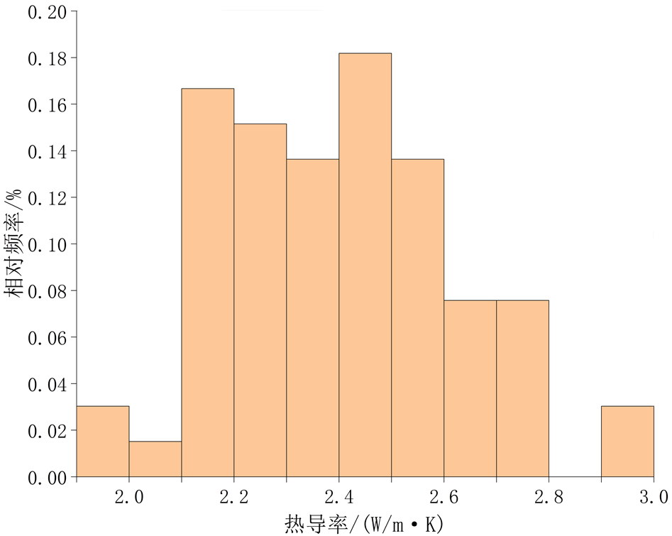 由表2得知研究区岩石热导率的整体变化范围为1.92~2.90 W/(m·K),其中11线的热导率波动范围最大,8线的波动范围相对较小,表明不同区域的岩石在热传导性能上存在显著的空间差异性,这说明与各采样线所涉及的岩性组成、岩石致密程度及孔隙发育状况等地质因素的差异密切相关。由其分布图可得出热导率基本呈正态分布(图6),其中2.1~2.6 W/(m·K)区间的样品占据主导地位,相对频率达到 77%,而2.6~3.0 W/(m·K)的相对频率则相对较低,且随着热导率的增大,相对频率整体呈递减趋势,反映了研究区岩石在热传导性能上存在一定的差异性。