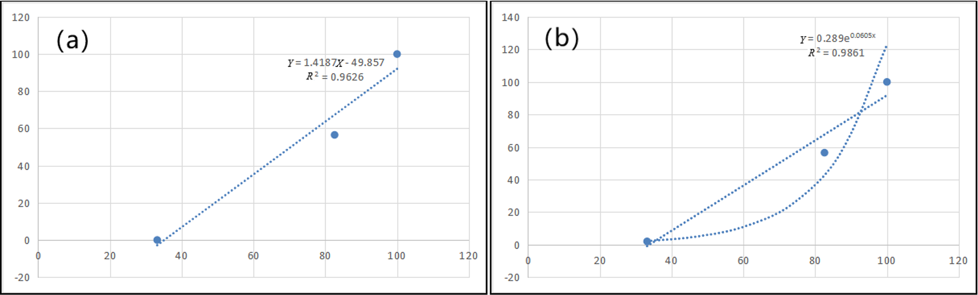 图6线性趋势拟合曲线(a)与乘幂趋势拟合曲线图(b)