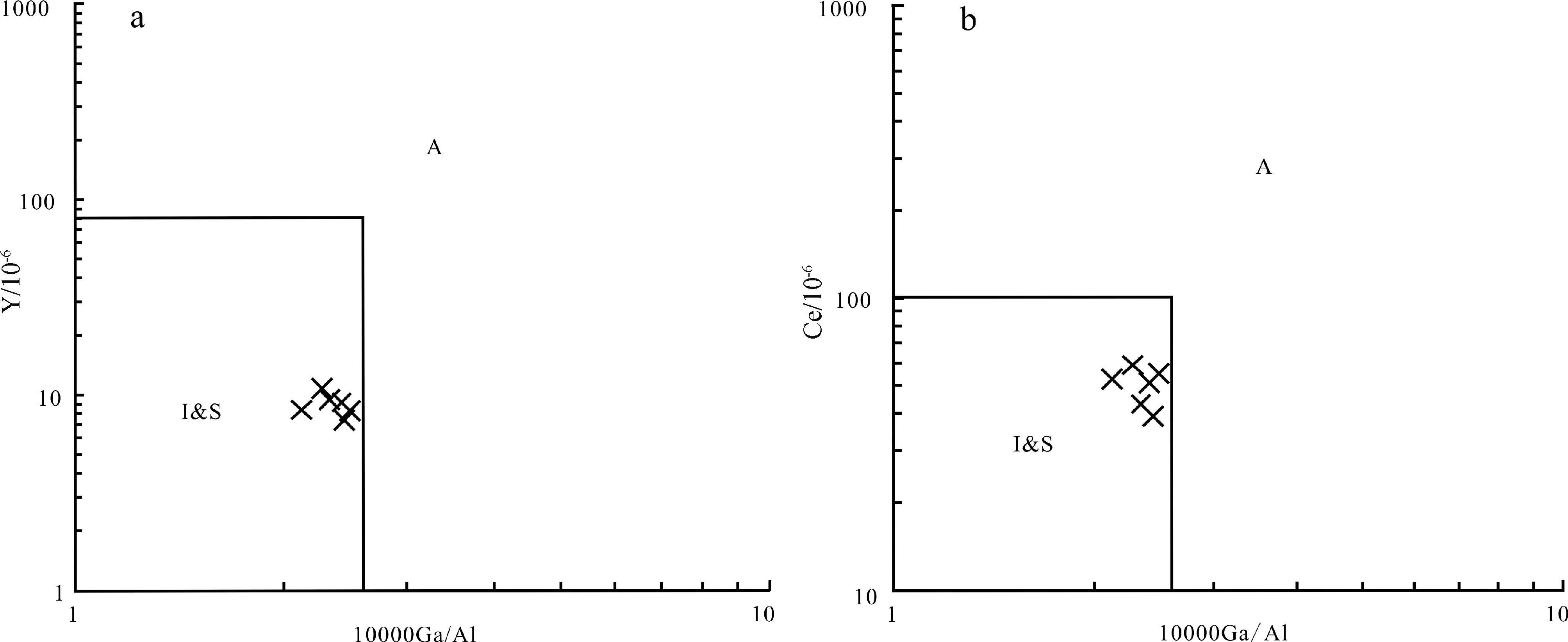 霍洛台河西岸斑状二长花岗岩具有较高的SiO2 和 Al2O3、较低的 MgO 和 TFe2O3含量,A/CNK=1. 01~1.14,与I型花岗岩特征相似;岩石10000Ga/Al值介于 2.13~2.50,平均值为 2.35,低于 A 型花岗岩的 Ga 下限值(2.6×10-6)(Whalen et al.,1987),在Y-10000Ga/Al、Ce-10000Ga/Al 图解中(图8),样品均落入I或S型花岗岩区域;岩石矿物组成主要为石英和长石(钾长石、斜长石),暗色矿物为黑云母,副矿物为磁铁矿、磷灰石、锆石等,未见富铝矿物(如堇青石、石榴石和原生的白云母等),在矿物组合上也与 I 型花岗岩矿物组合特征相似(李俊杰,2005; 马国祥等,2016;高歌悦等,2018;左海洋等,2021; 刘文毅等,2022);岩石P2O5含量较低,随SiO2含量的增加而变低(图6b),呈负相关关系,与典型的S型花岗岩不符(Chappell,1999;邓红宾等,2018)。因此,斑状二长花岗岩应为高钾钙碱性系列的弱过铝质 I 型花岗岩。